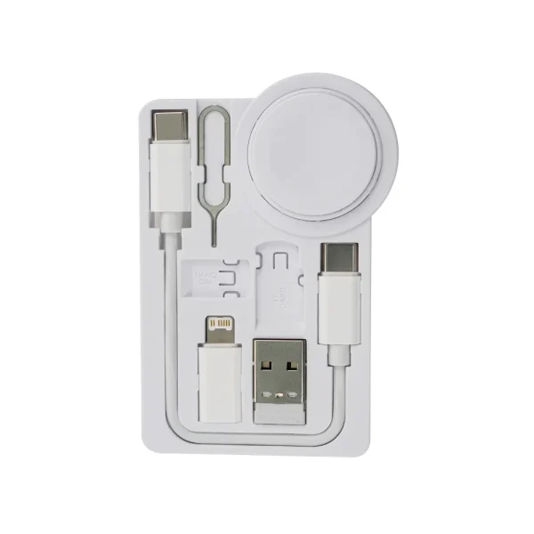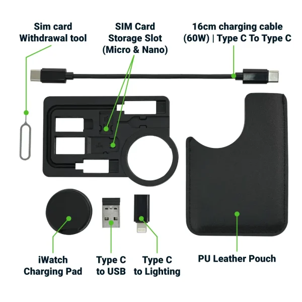 Premium Charging Cable Kit  60W power capacity, featuring multiple ports including Type-C, USB, and Lightning, along with a 3W iWatch charging pad. Housed in a stylish PU leather pouch that includes storage slots for Micro and Nano SIM cards and a SIM card withdrawal tool — making it an all-in-one travel-ready accessory.